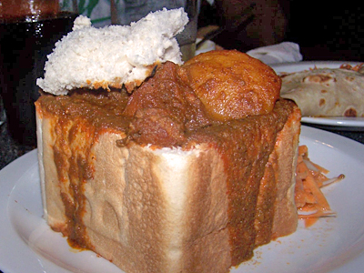• Bunny Chow (South Africa) – Spicy curry in a hollowed-out bread loaf.